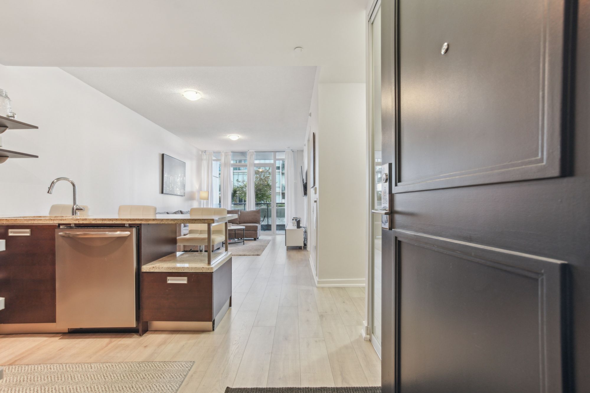 The open-concept layout is perfect for entertaining, with floor-to-ceiling windows that fill the space with natural light. The kitchen is a chef's delight, featuring granite countertops, stainless steel appliances, and abundant counter space. A versatile den offers extra space for a home office or a quiet retreat. Just steps from the waterfront and Lakeshore, this location is perfect for outdoor enthusiasts.